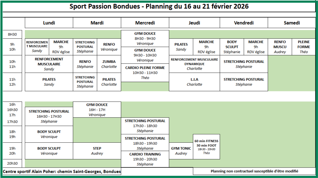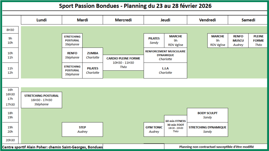 Pour ses cours du jeudi soir Audrey vous proposera des ateliers training, ce sont des enchainements de 1 à 2 min sur un même exercice, au poids du corps ou avec un accessoire (ballon, bâton, step, …)